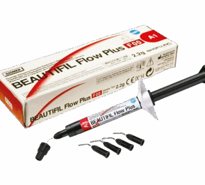 Resina fluida Beautifil Flow Plus de Shofu, disponible en múltiples tonos y viscosidades (F00 y F03). Ideal para restauraciones mínimamente invasivas y estratificadas.