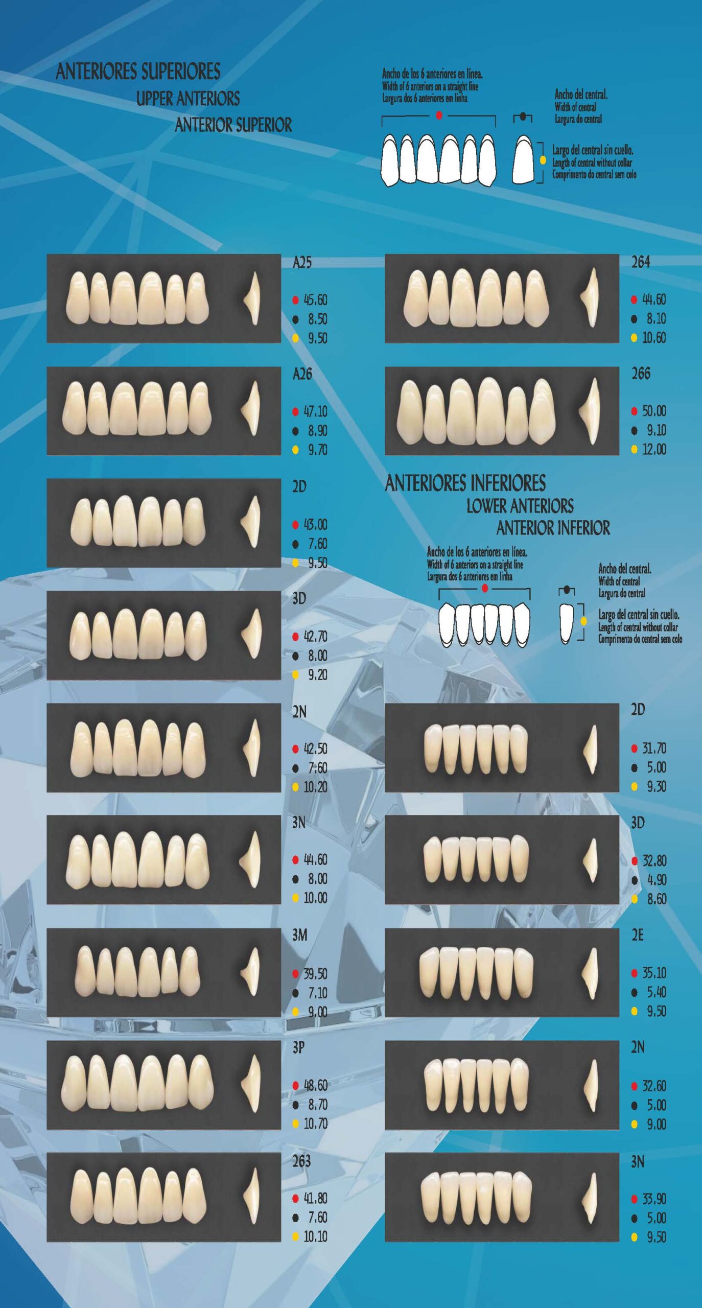 Disponibles en versiones anteriores y posteriores, superiores e inferiores, en diversos modelos anatómicos (2E, 3N, 3P, 3L, 30M, 34L…) y tonos VITA (A1–C1) para una adaptación estética y funcional precisa.