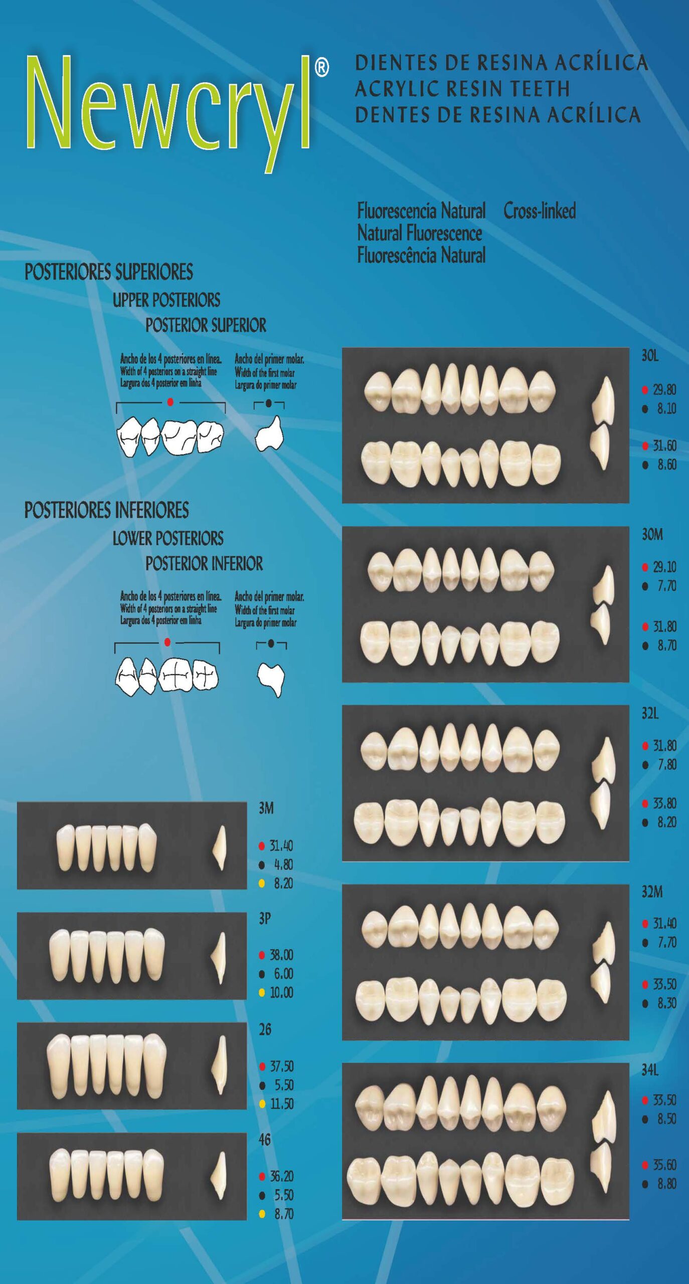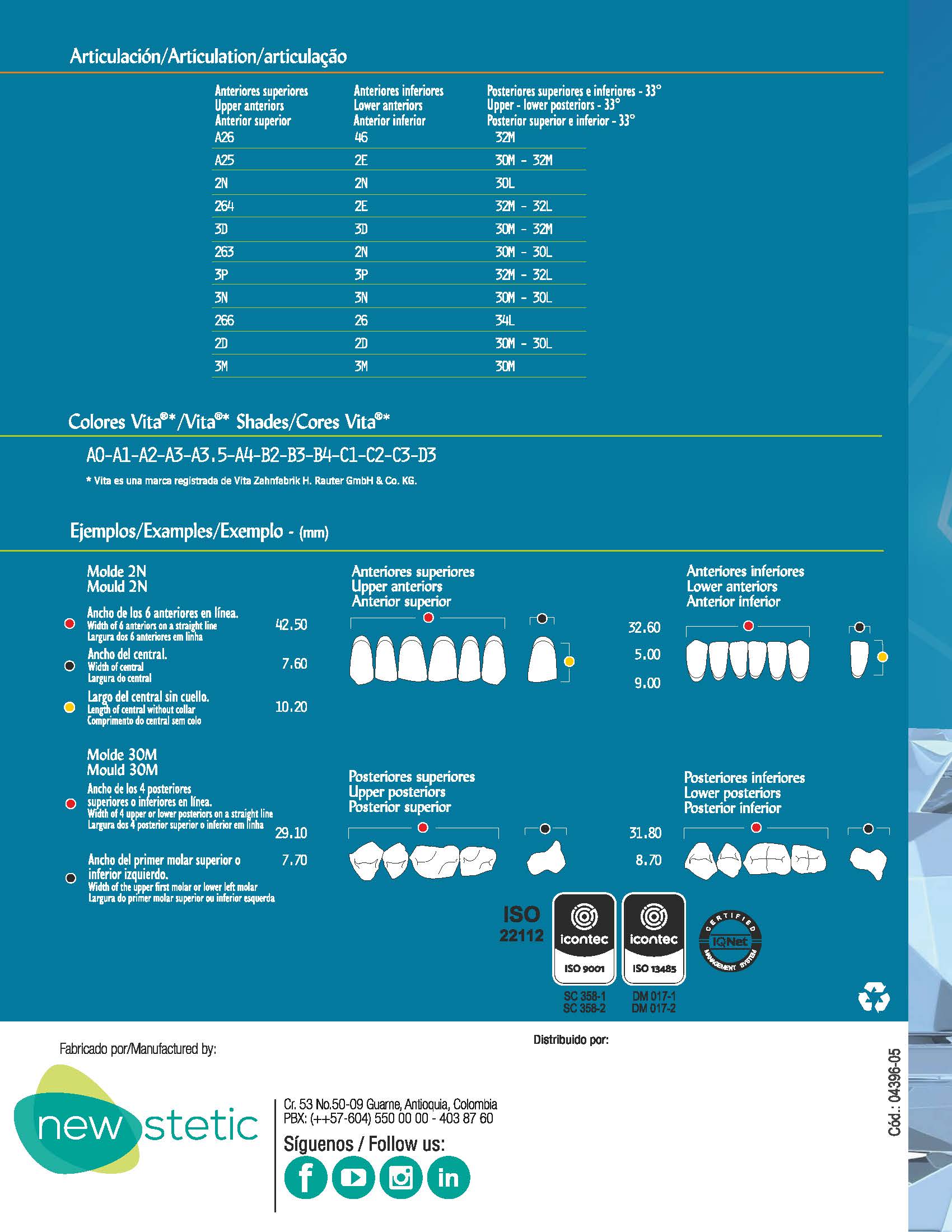 Dientes de resina acrílica NEWCRYL® de New Stetic, fabricados bajo norma ISO 22112. Ideales para prótesis totales y parciales removibles.