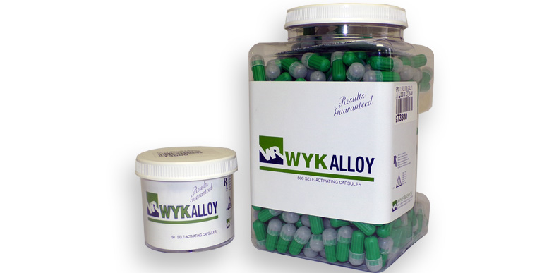 Cápsulas de amalgama premedidas marca Wykalloy. Disponibles en presentación de 1 y 2 porciones por cápsula.